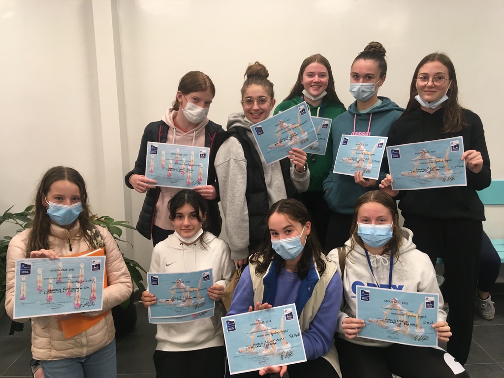 Ce dimanche 21 novembre, 11 de nos nageuses artistiques se sont déplacées à Vannes pour passer leur Sycnhro Découverte ou leur Synchro Argent. C'est un beau bilan puisque 7 d'entre-elles valident complètement leur synchronat'. Bravo à Enora (2 médailles d'argent), Joséphine (une médaille d'or), Lola et Thylane pour leur Syncho Argent, et à Klervi, Morane et Anna pour leur Synchro Découverte. Léa valide les épreuves du Synchro Découverte et Anaëlle la propulsion technique du Synchro Argent.